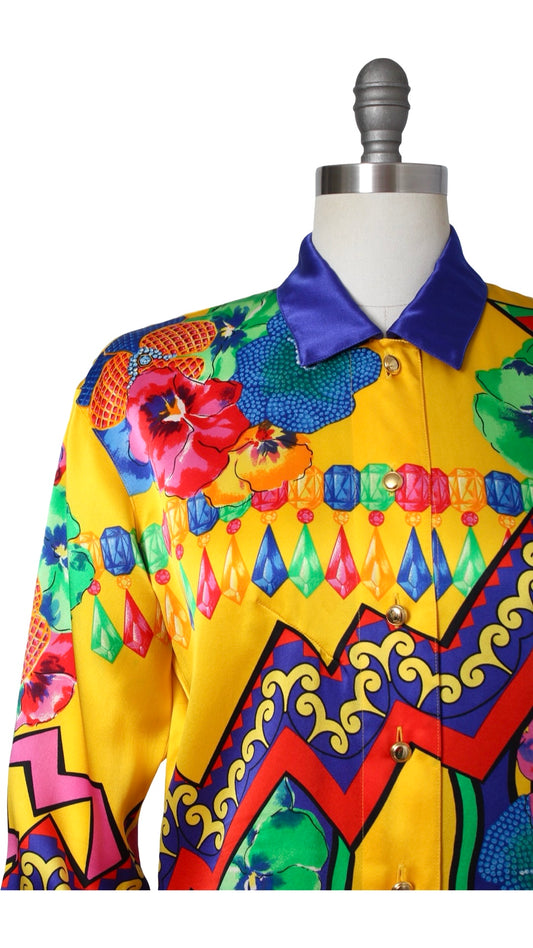 1990s ESCADA Silk Gem Floral Novelty Print Blouse | medium/large