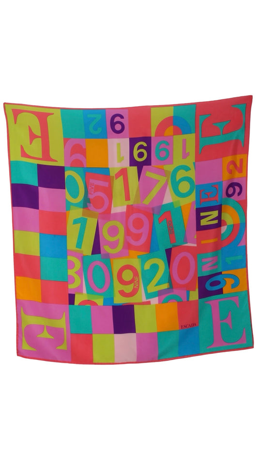 1990s ESCADA Silk Numbers Letters Novelty Print Scarf