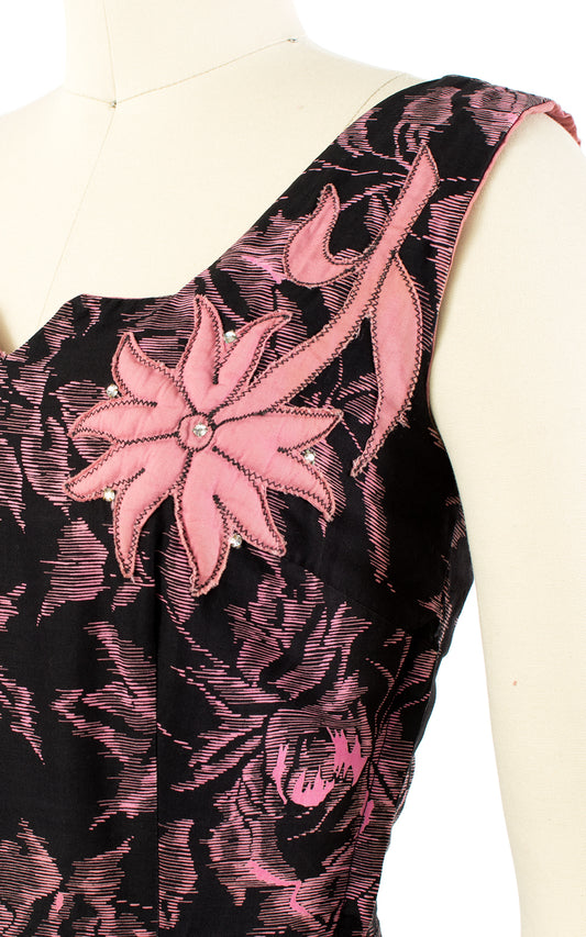 $65 DRESS SALE /// 1950s Rose Print Appliqué Rhinestones Black Cotton Sundress | x-small