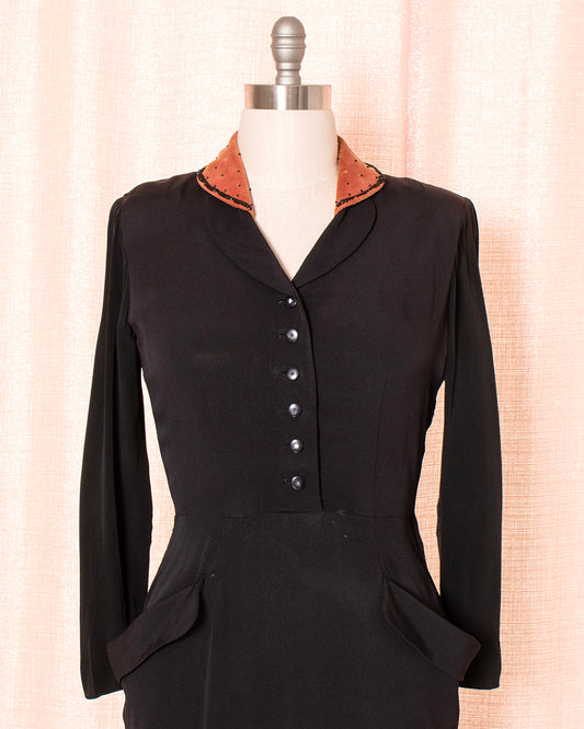 [AS-IS] 1940s Black Rayon Beaded Velvet Collar Shirtwaist Cocktail Dress | large