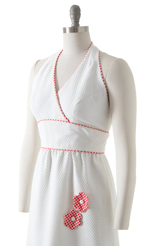 1970s Gingham Floral 3D Cotton Halter Maxi Dress | small