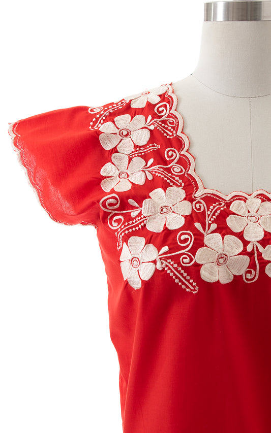 1980s Floral Embroidered Red Top | small/medium