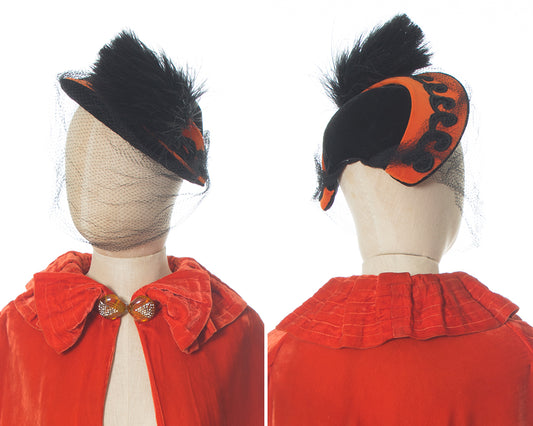 1940s 1950s Velvet & Feather Pom Pom Hat with Veil
