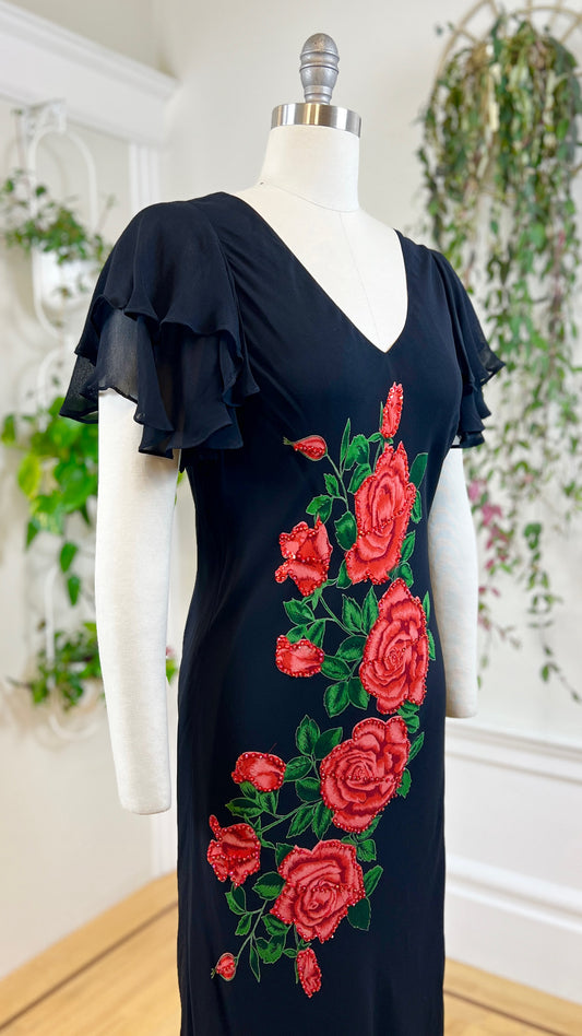 2000s Sequin Roses Bias Cut Rayon Dress | medium/large