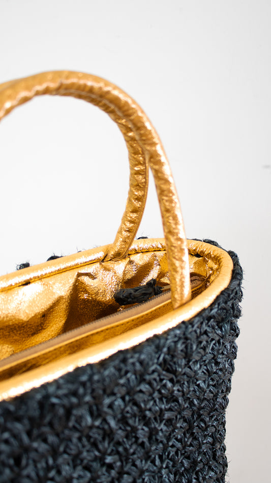 1960s Black Raffia & Gold Foil Handbag