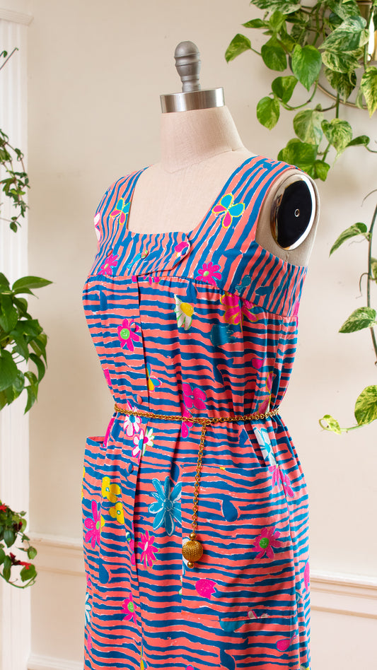 1960s 1970s Hawaiian Floral Striped Shirtwaist Maxi Dress | medium/large