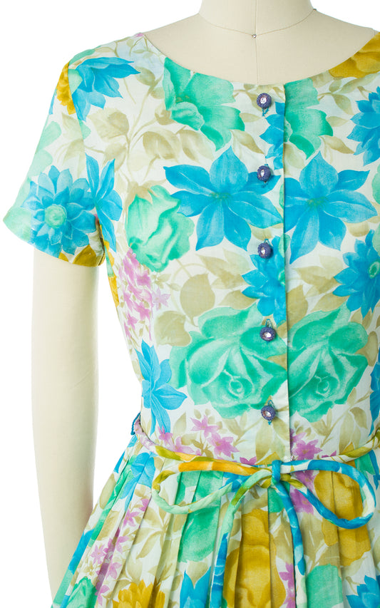 1950s Floral Polka Dot Striped Cotton Shirtwaist Dress | small