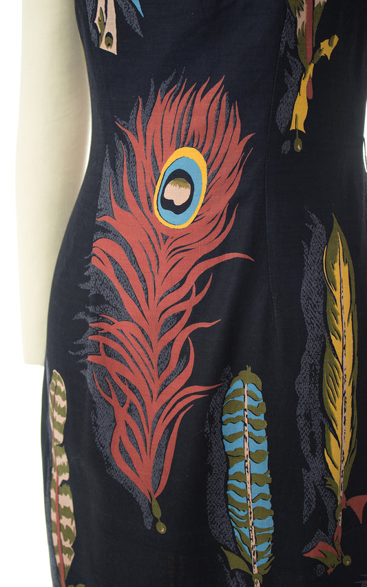 1960s Peacock Feather Novelty Print Wiggle Dress | small