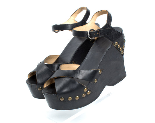 1970s Studded Black Leather and Wood Platform Wedge Sandals | size 6