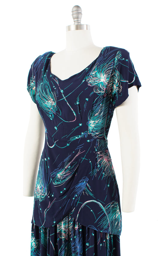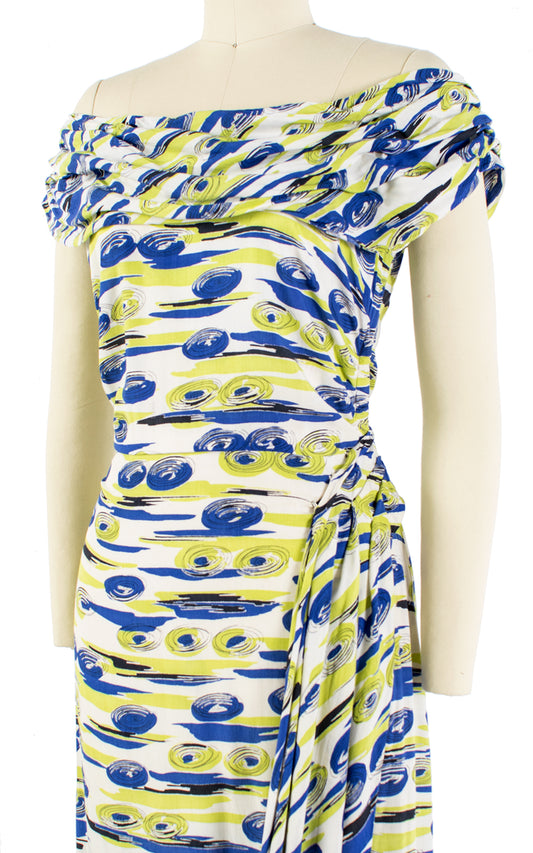 1940s Abstract Spirals Novelty Print Draped Sash Gown | small