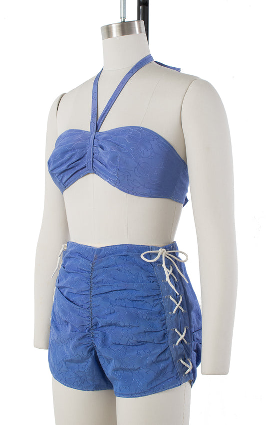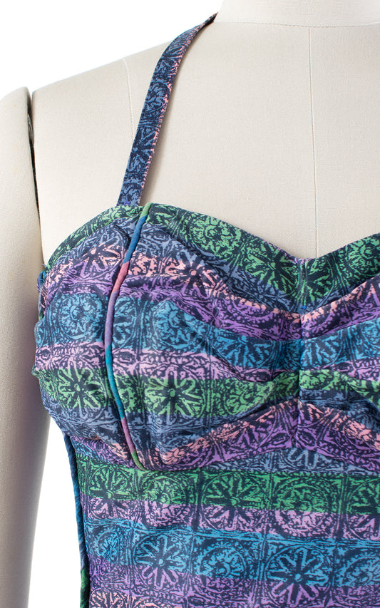 1950s Striped Floral Halter Draped Swimsuit | small/medium
