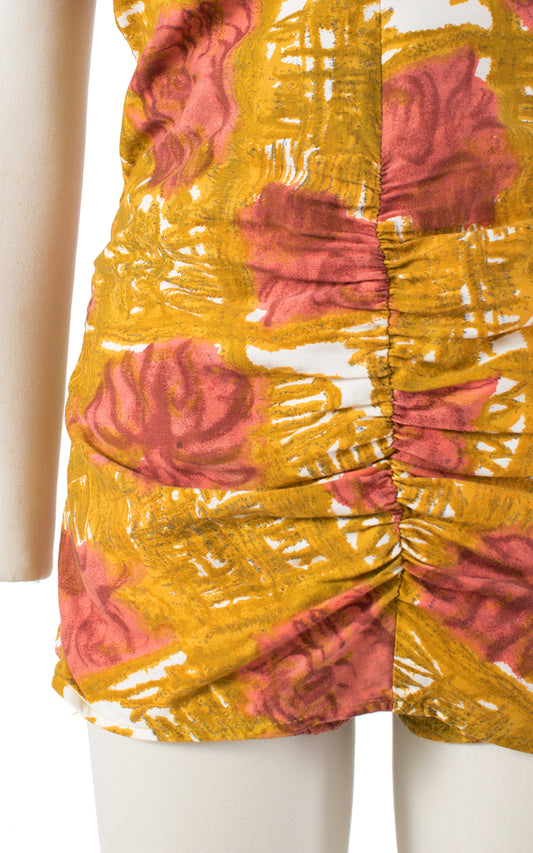 1960s Floral Ruched Smocked Mustard Yellow Swimsuit | medium/large