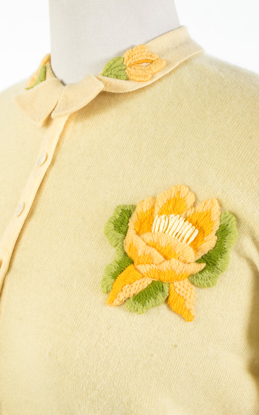 1950s Floral Appliqué Cashmere Knit Yellow Cardigan Top | x-small/small/medium