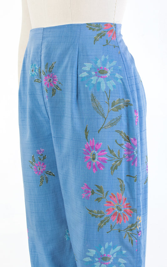 1950s Floral Blue Cotton High Waisted Capri Pants | small