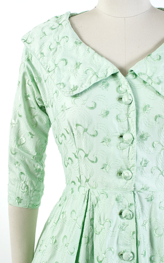 1950s Tulip Embroidered Mint Green Cotton Shirtwaist Dress | medium
