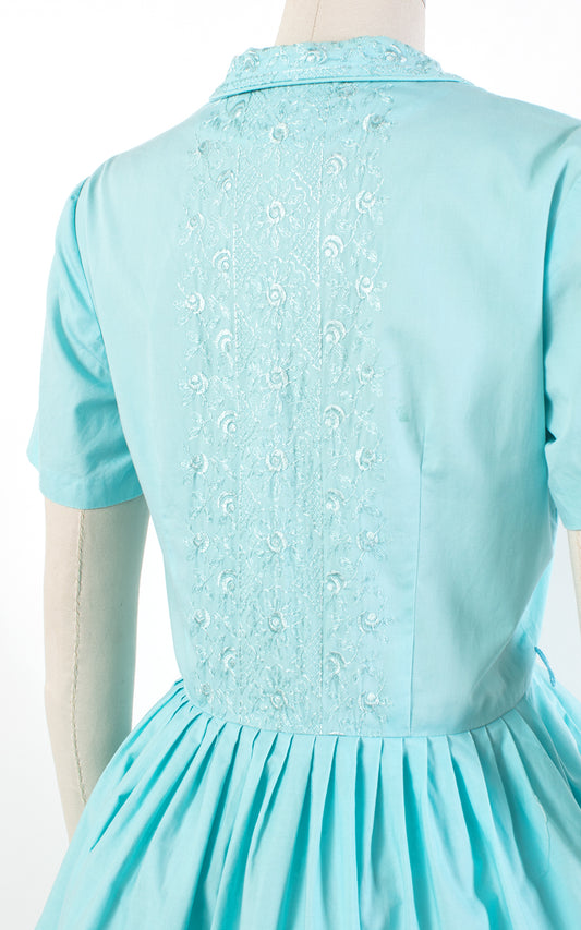 1950s Floral Embroidered Blue Cotton Shirtwaist Dress | large