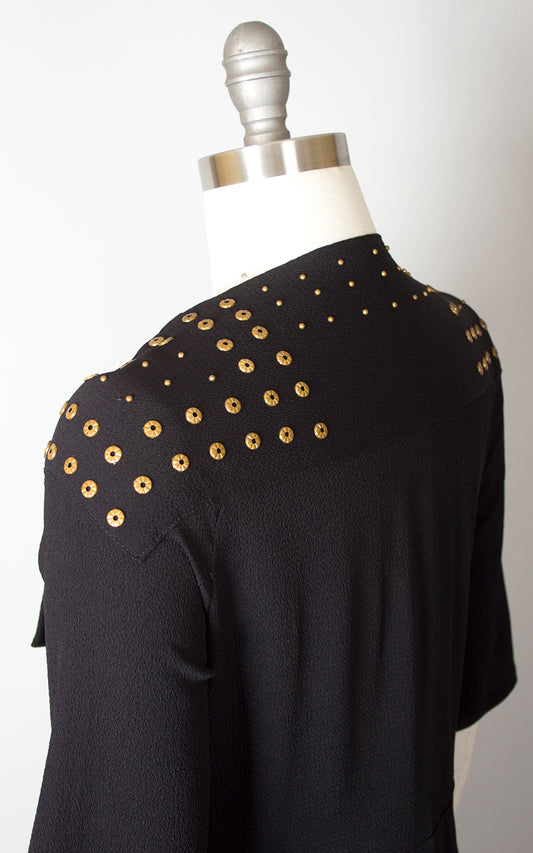 1930s Brass Studded Black Rayon Crepe Cocktail Dress | small