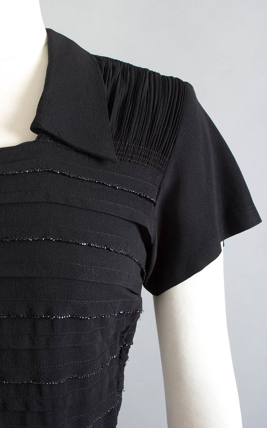 1940s Beaded Pintuck Black Rayon Cocktail Dress | medium