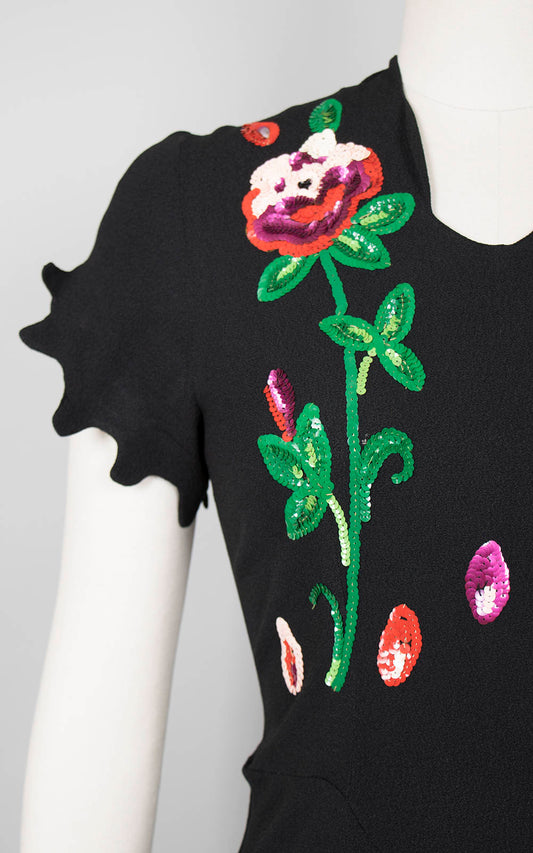 $50 & UNDER SALE || 1940s Style Sequin Rose Black Rayon Crepe Cocktail Dress | medium