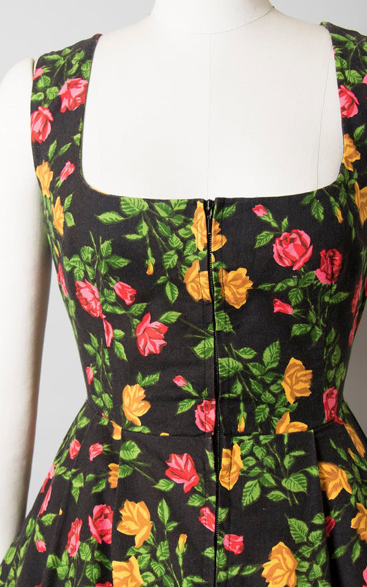1960s Rose Print Black Cotton Dirndl Dress | medium/large