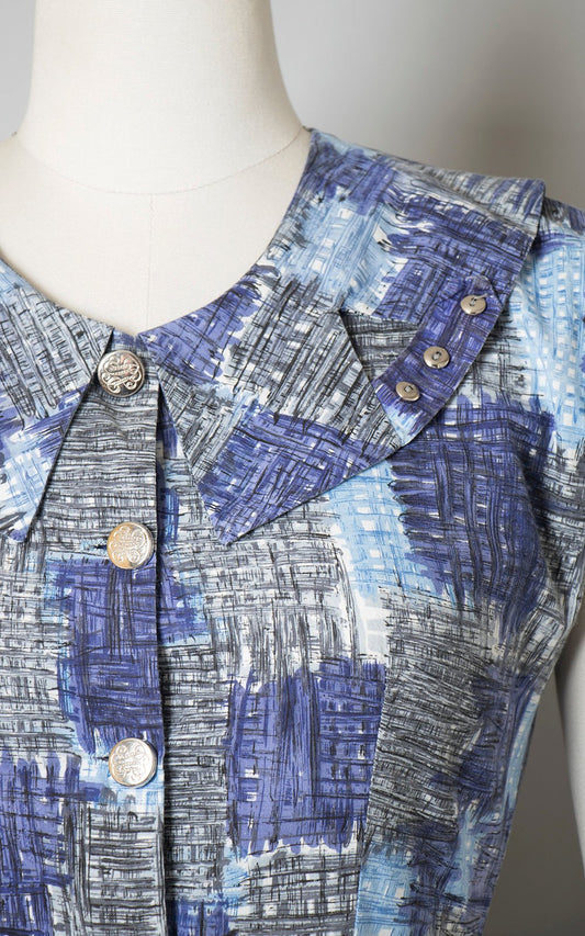 π SPRING CLEAROUT π 1950s Patchwork Printed Blue Cotton Shirt Dress | small/medium