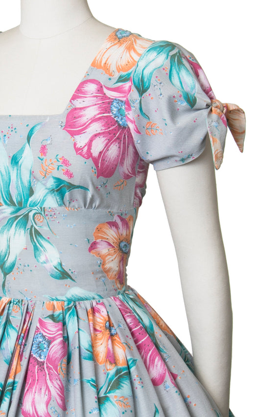 1960s Tropical Floral Grey Tied Sleeve Dress | small