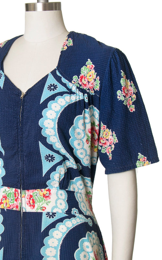 1940s Floral Blue Cotton Maxi Dressing Dress | large/x-large
