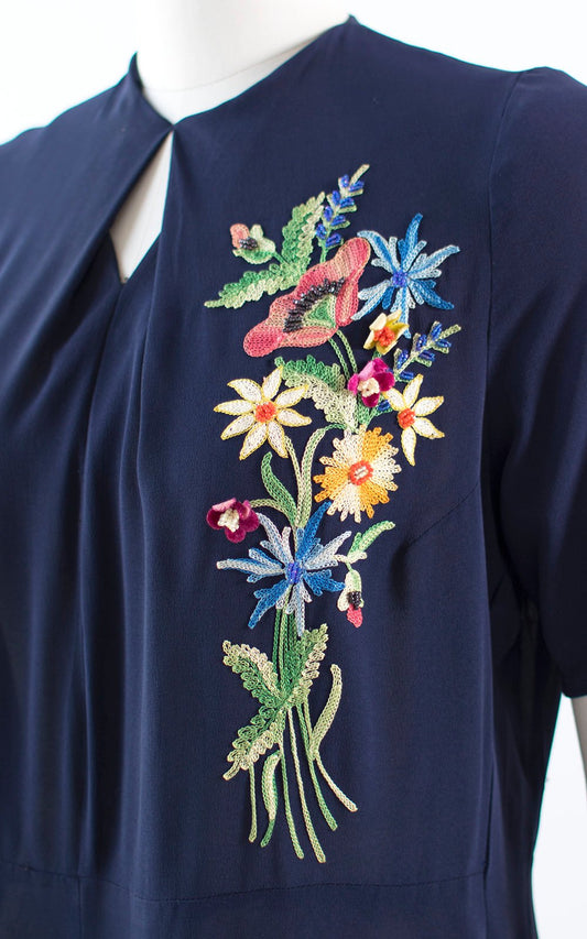 1940s Floral Chainstitch Embroidered Navy Blue Rayon Cocktail Dress | large/x-large