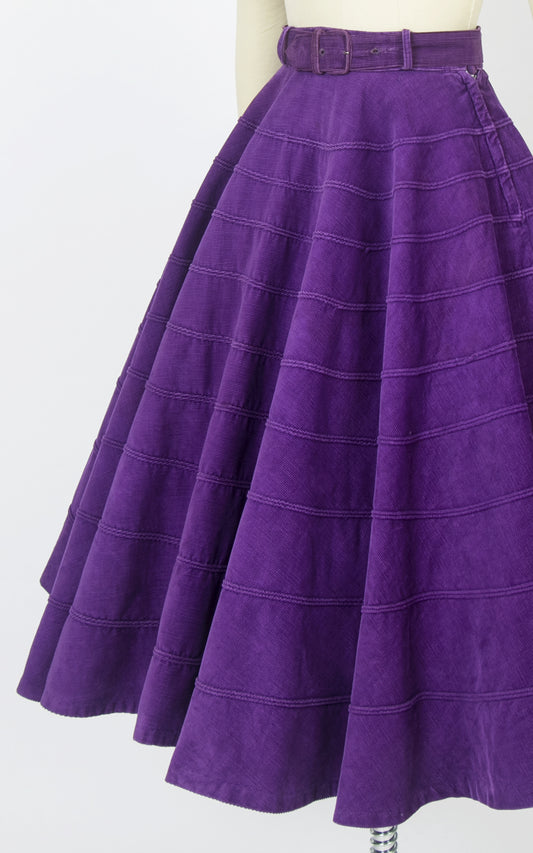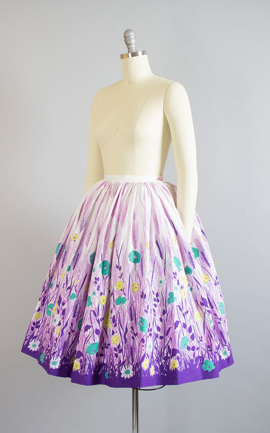 1950s Floral Border Print Purple Cotton Skirt | x-small