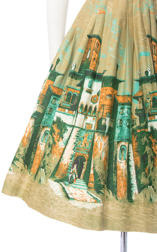 1950s European Village Novelty Border Print Green Cotton Skirt | small