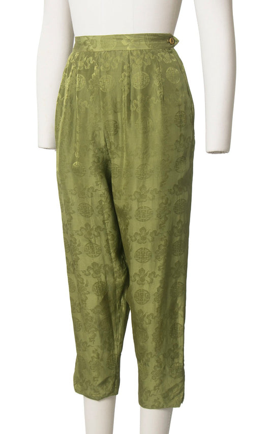 1950s 1960s Silk Olive Green Asian Jacquard High Waisted Capris | small
