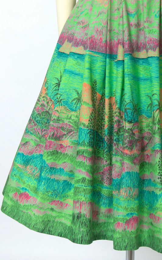 1960s Hawaiian Beach Novelty Border Print Green Cotton Skirt | small