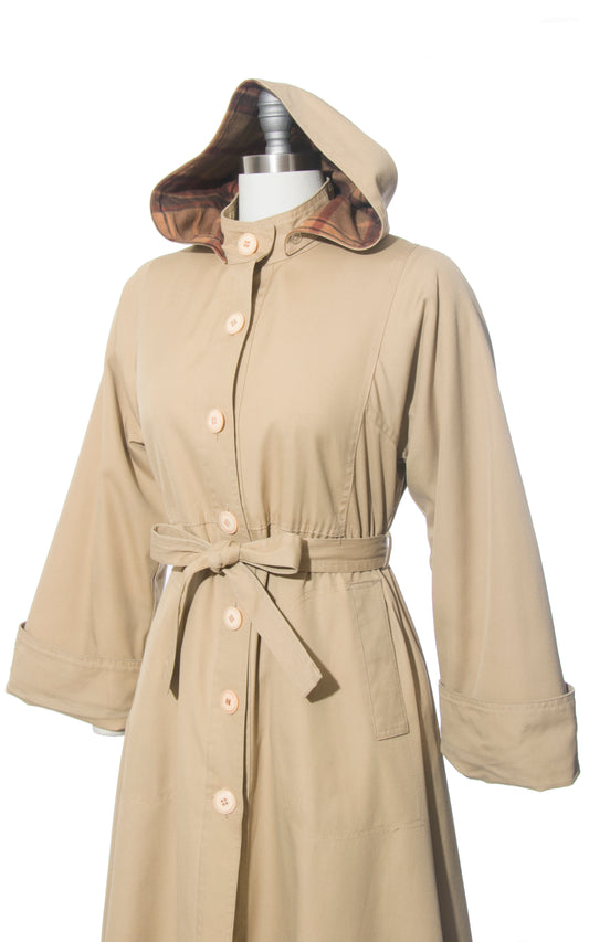 1970s Hooded Plaid Lined Tan Belted Trench Coat | medium