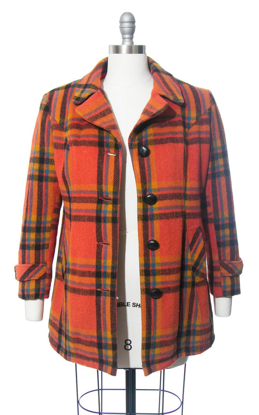 Sold out1970s Orange Plaid Pea Coat | medium
