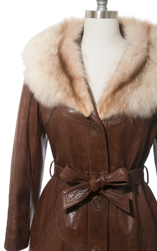 1970s Brown Leather Fox Fur Collar Princess Coat | medium