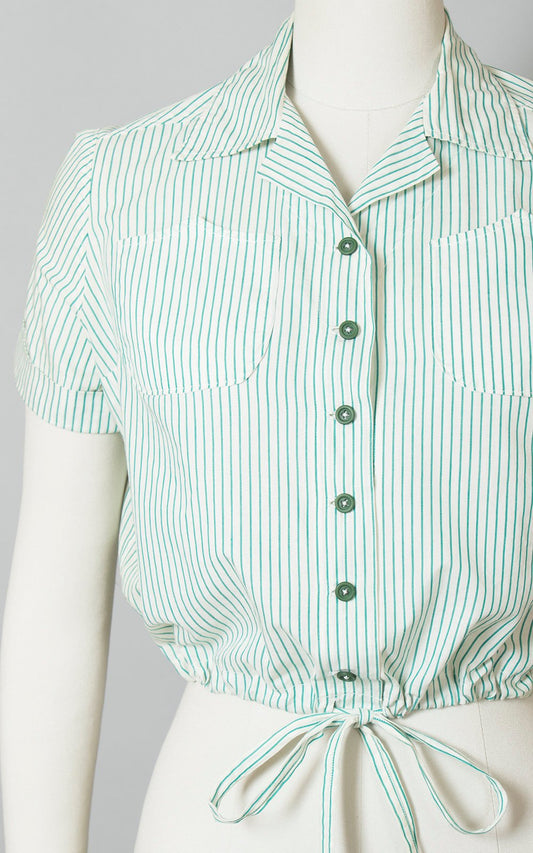 1950s 1960s Green Pinstriped Cropped Drawstring Blouse | medium