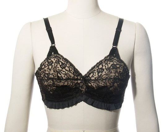 1950s Sheer Black Satin and Lace Wireless Bullet Bra | 32C