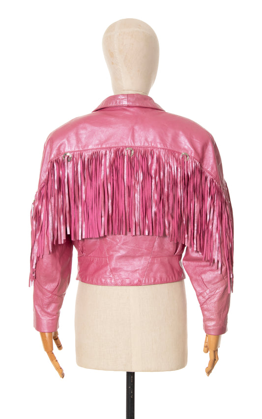 1980s Pearlescent Pink Leather Fringe Jacket | large