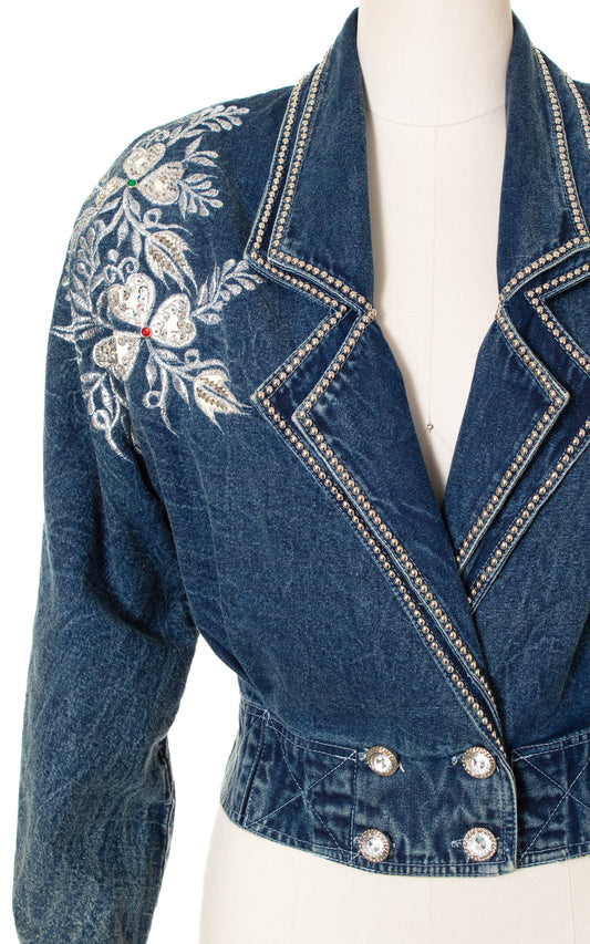 1980s Floral Embroidered Rhinestone Cropped Denim Jacket | medium/large