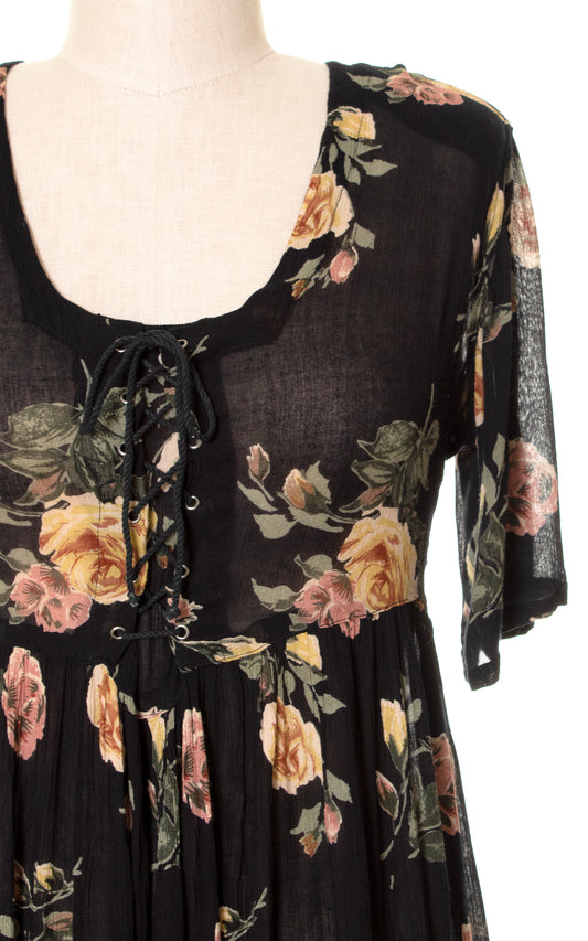 1990s Lace-Up Rose Print Cotton Gauze Dress | medium/large/x-large