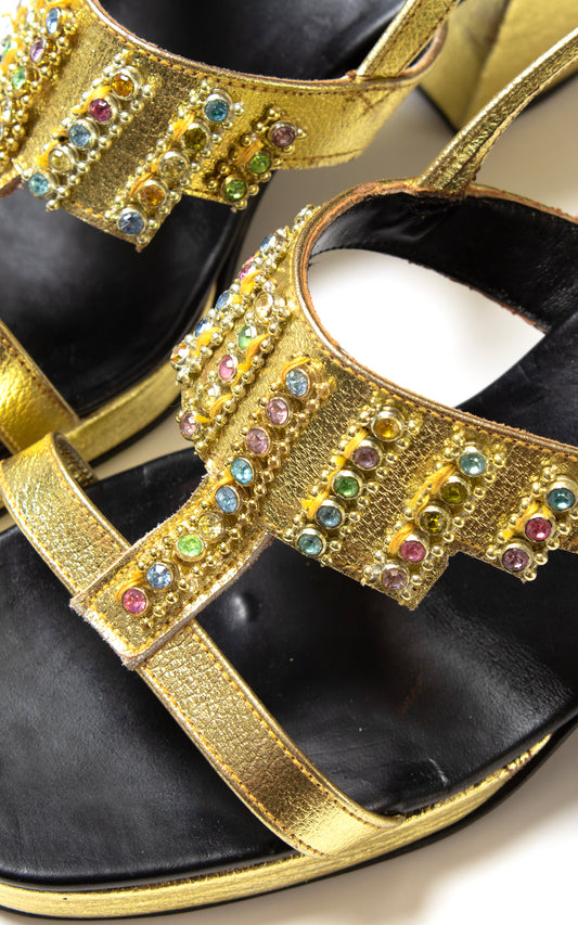 1960s Rhinestone Jeweled Gold Platform Sandals | size US 6