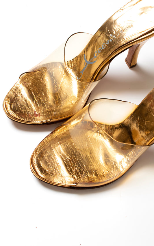 1950s 1960s Clear Vinyl & Gold Stiletto Mules | size US 6