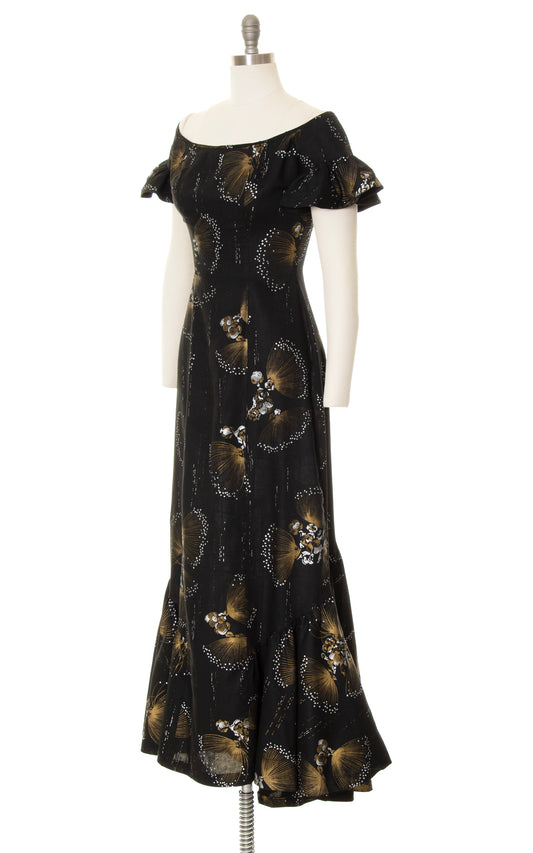 1960s Metallic Floral Hawaiian Holomuu Mermaid Dress | small