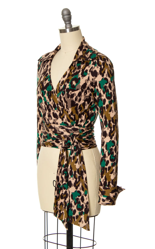 MODERN 1970s Style DIANE VON FURSTENBERG Leopard Print Silk Jersey Wrap Top | x-small/small