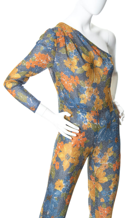 1970s Metallic Floral One Shoulder Jumpsuit | small/medium