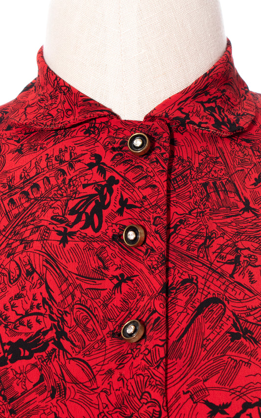 1940s People Novelty Print Red Rayon Shirtwaist Dress | medium/large