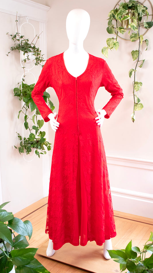 1970s Red Lace Palazzo Jumpsuit with Overskirt | large