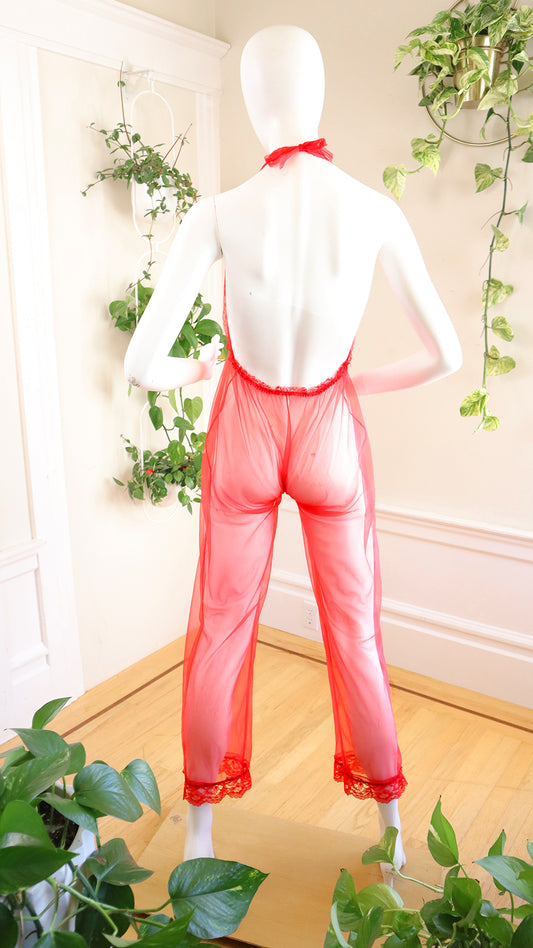 1970s 1980s Sheer Red Nylon Halter Jumpsuit | small/medium/large