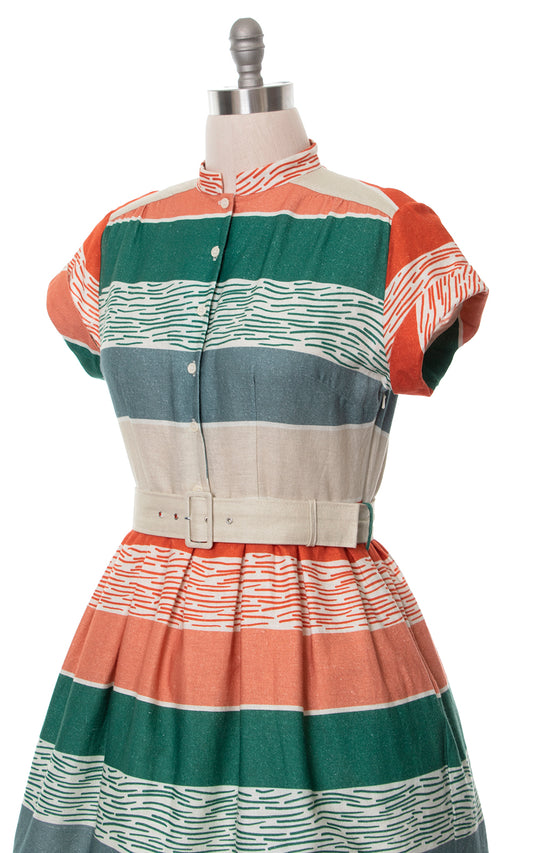 MODERN 1950s Style Striped Linen Blend Shirt Dress | large