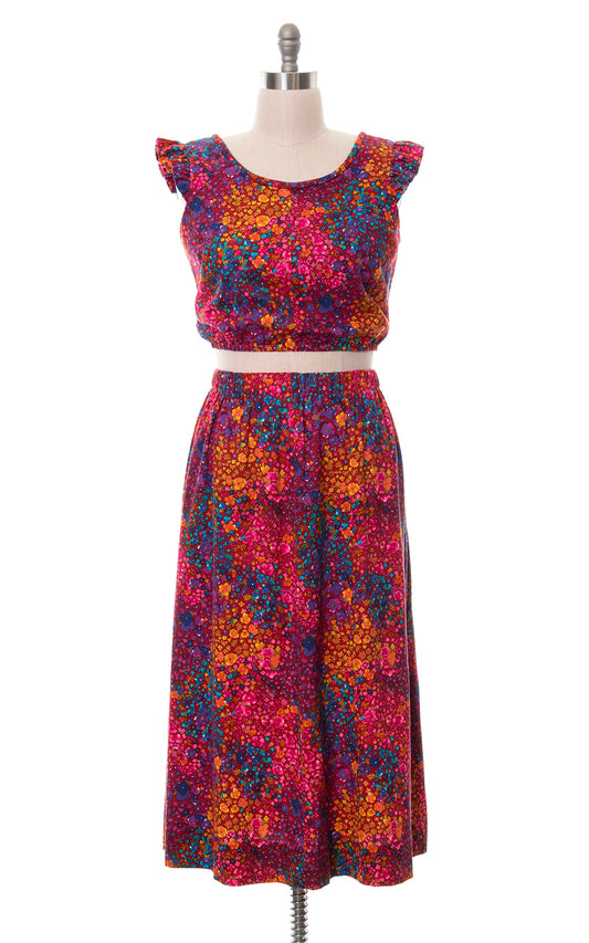 1960s 1970s Floral Barkcloth Top & Skirt Set | small/medium/large